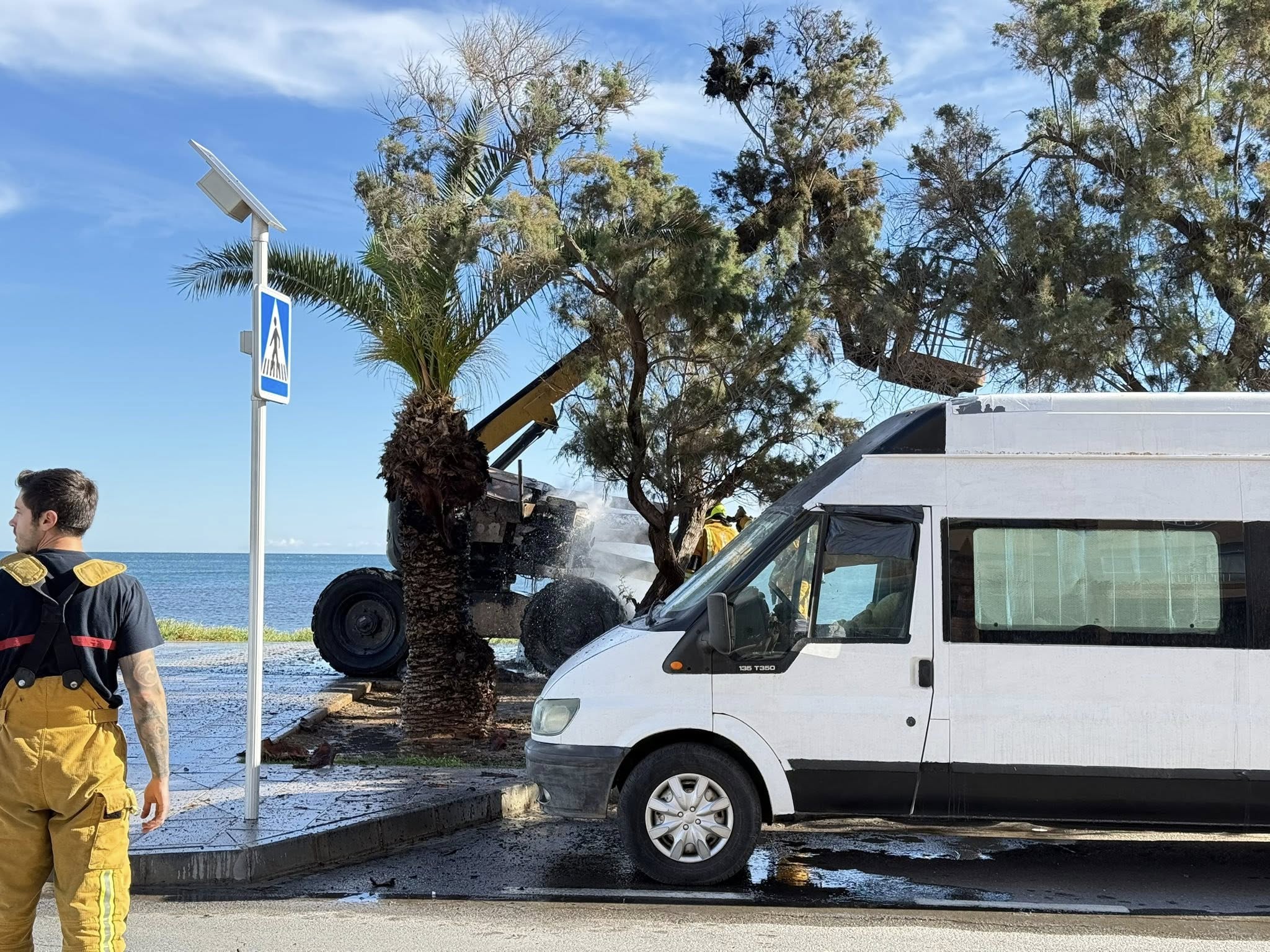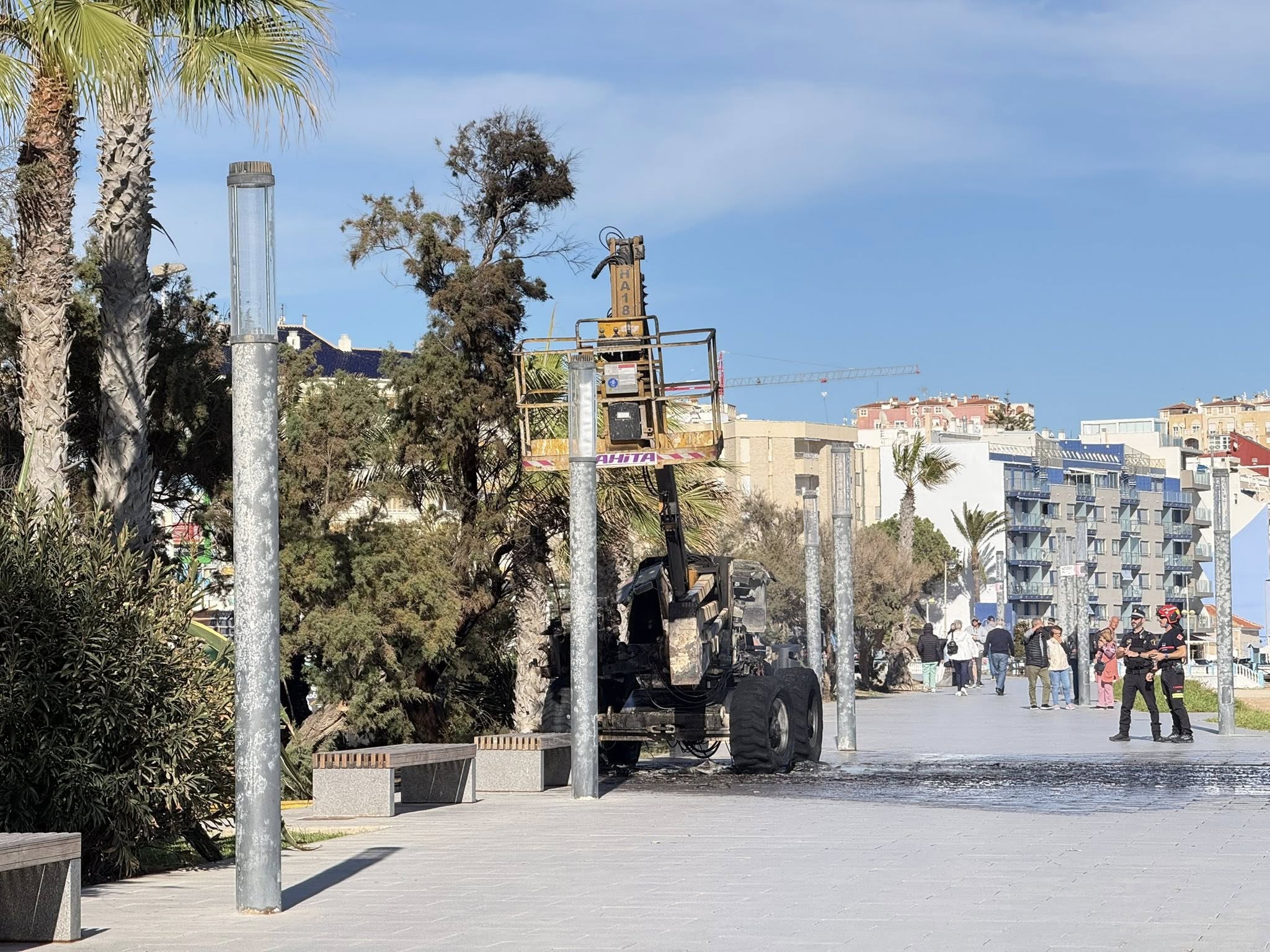 TORREVIJA — Un violento incendio ha completamente distrutto la piattaforma di lavoro sopraelevata utilizzata dall'azienda di manutenzione di parchi e giardini di Torrevieja per un'urgente ispezione di sicurezza delle palme.