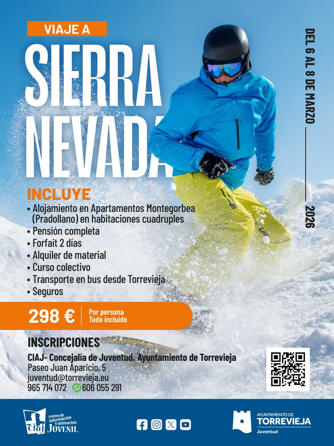 Torrevieja, 19 dicembre 2025 — Il Dipartimento della Gioventù di Torrevieja ha annunciato l'organizzazione di un viaggio di fine settimana in Sierra Nevada, nella provincia di Granada, per gli appassionati di sci e snowboard. Il viaggio si svolgerà da Marzo 6 a 8, 2026, secondo il Consigliere dei Giovani Domingo Paredes Ibáñez.