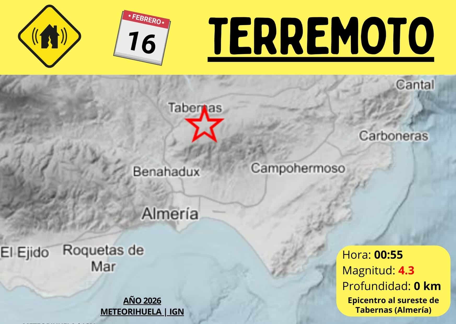 della Spagna Istituto Geografico Nazionale ha confermato che la scossa si è verificata alle 00:55. Inizialmente era stata registrata una magnitudo di 4.5, prima di essere ridotta a 4.3. La profondità ridotta – praticamente in superficie, vicino alla zona del Desierto de Tabernas – spiega perché la scossa è stata così intensa.